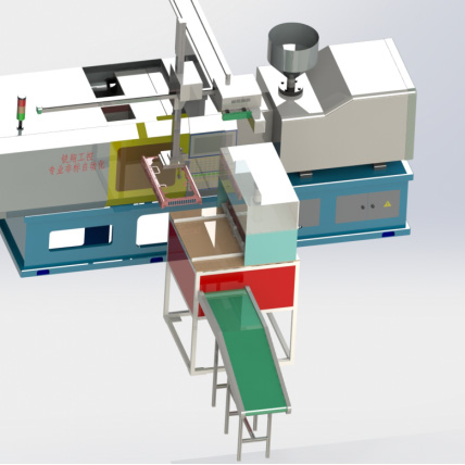 - 美的空調外殼面板自動切水口設備,利用三軸機械手從注塑機抓去,然后自動切除水口,自動擺放到流水線,到下一個工位。實現(xiàn)車間無人化,投入成本低,產品切換簡單容易,已經成為注塑行業(yè)的標準配置。